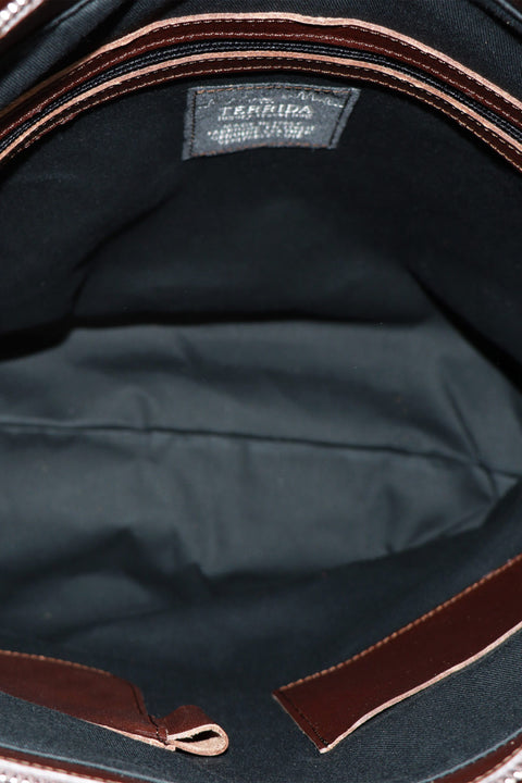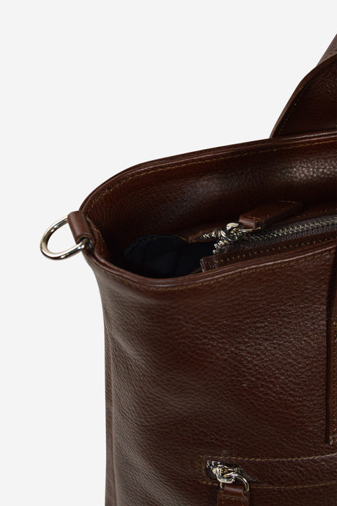 Description Material: vegetable tanned leather Handmade in Italy Closure: zip closure Width: 38 cm Height: 38 cm Depth: 12 cm Handle: double handle Lining: lined interior Pockets: single external pocket...